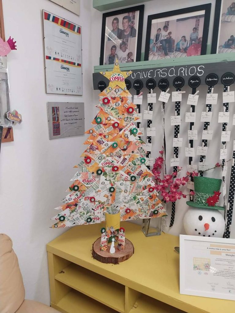 Mais um ano e mais um Natal Amarelo. Este projeto da Tetrapak em parceria com a Compal, inserido nas atividades do Programa Eco-Escolas, tem sido um projeto que abraçamos já há alguns anos, sendo muito apreciado pelos alunos. Este ano decidimos elaborar um pinheiro em moldes diferentes, reutilizando, exclusivamente as embalagens dos sumos Compal. Para completar mais o trabalho, decidimos colocar na sua base uma pequena representação do presépio, reutilizando também restos das embalagens utilizadas para a feitura da árvore. Foi um trabalho muito gratificante pela partilha de todos, alunos, docente e um técnico do Centro Comunitário da Nogueira.